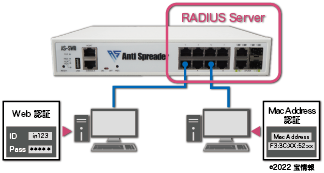 Anti Spreader は、ユーザー認証を行うRADIUSサーバ機能を標準で搭載しているため、導入の手間が省けます。Web認証/MAC認証/802.1X認証をサポートしています。