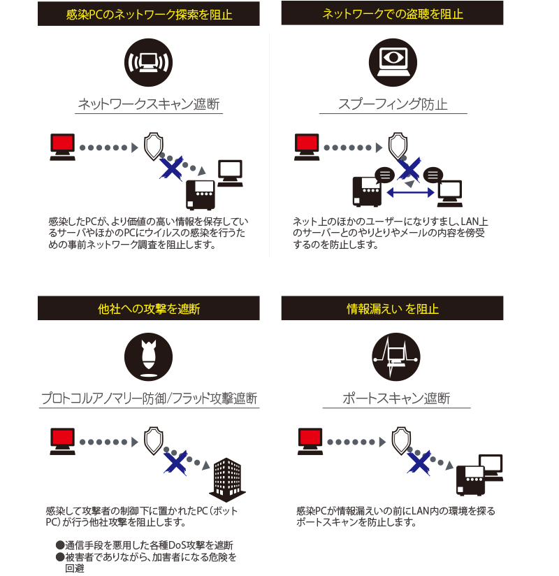 入り口対策のセキュリティが突破された後、感染の拡大・攻撃の実行など攻撃者の最終 目的を阻止します