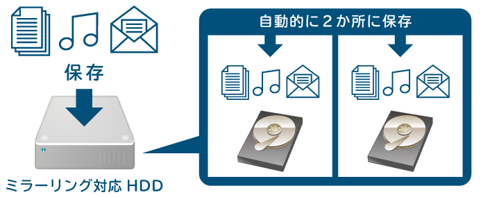 RAID1は、同じデータを2本のハードディスクに書き込みすることで耐障害性を高めた構成です。ハードディスク1本に障害が発生してもシステムは停止せずにデータも失われません。