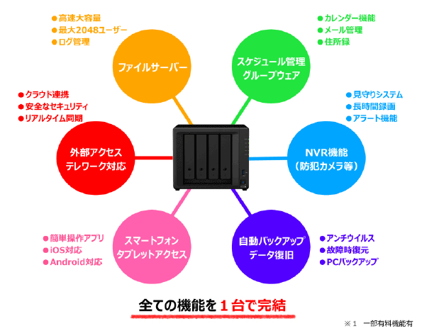 ネットワークビデオレコーダーやチャット・グループウェア機能・PCのバックアップデバイスとして等、様々な使い方が可能。
