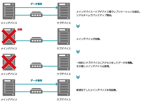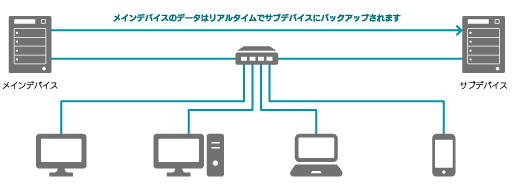 万が一メインデバイスが運用不能に陥ってしまった場合、ユーザーはサブデバイスにアクセスすることで故障直前のデータにアクセスすることができます。 メインデバイスはサブデバイスにリアルタイムでバックアップを行いますので、データをロスすることなく業務を再開することができます。