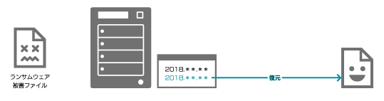 世代バックアップの中からファイルを選択して復元することができます。 万が一ファイルが消えてしまったり、ファイルを間違えて上書き保存してしまった時など、1ファイル単位からの復元が可能です。 ランサムウェアなどにより被害にあったファイルもファイル復元機能により復元することができるため、より安全で安心な運用が可能となっています。