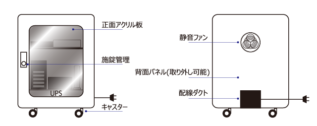 前面には収納した機器の動作状況の確認できるスモークアクリル板を装備(難燃タイプ)。